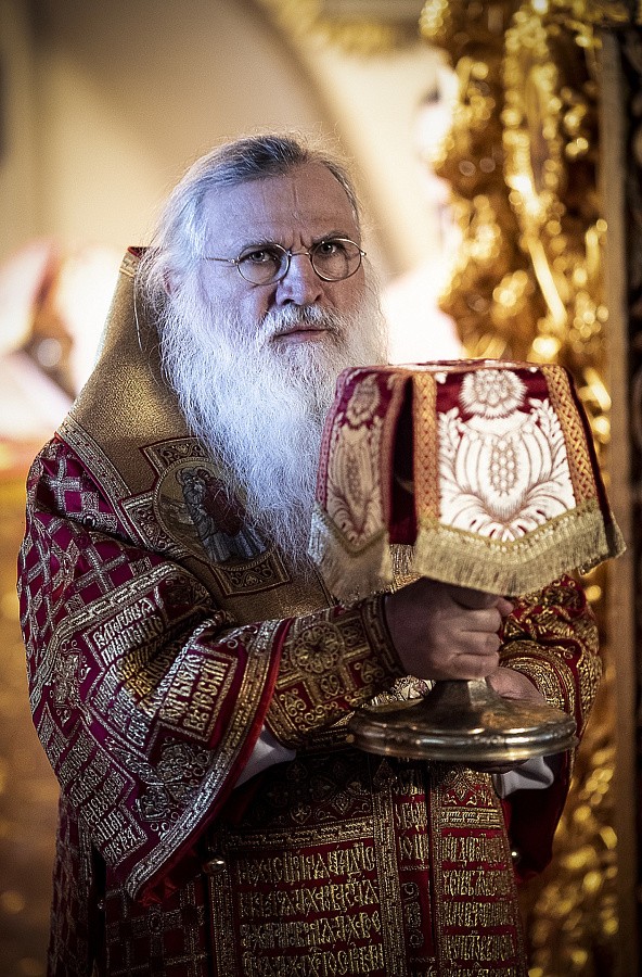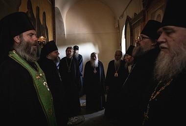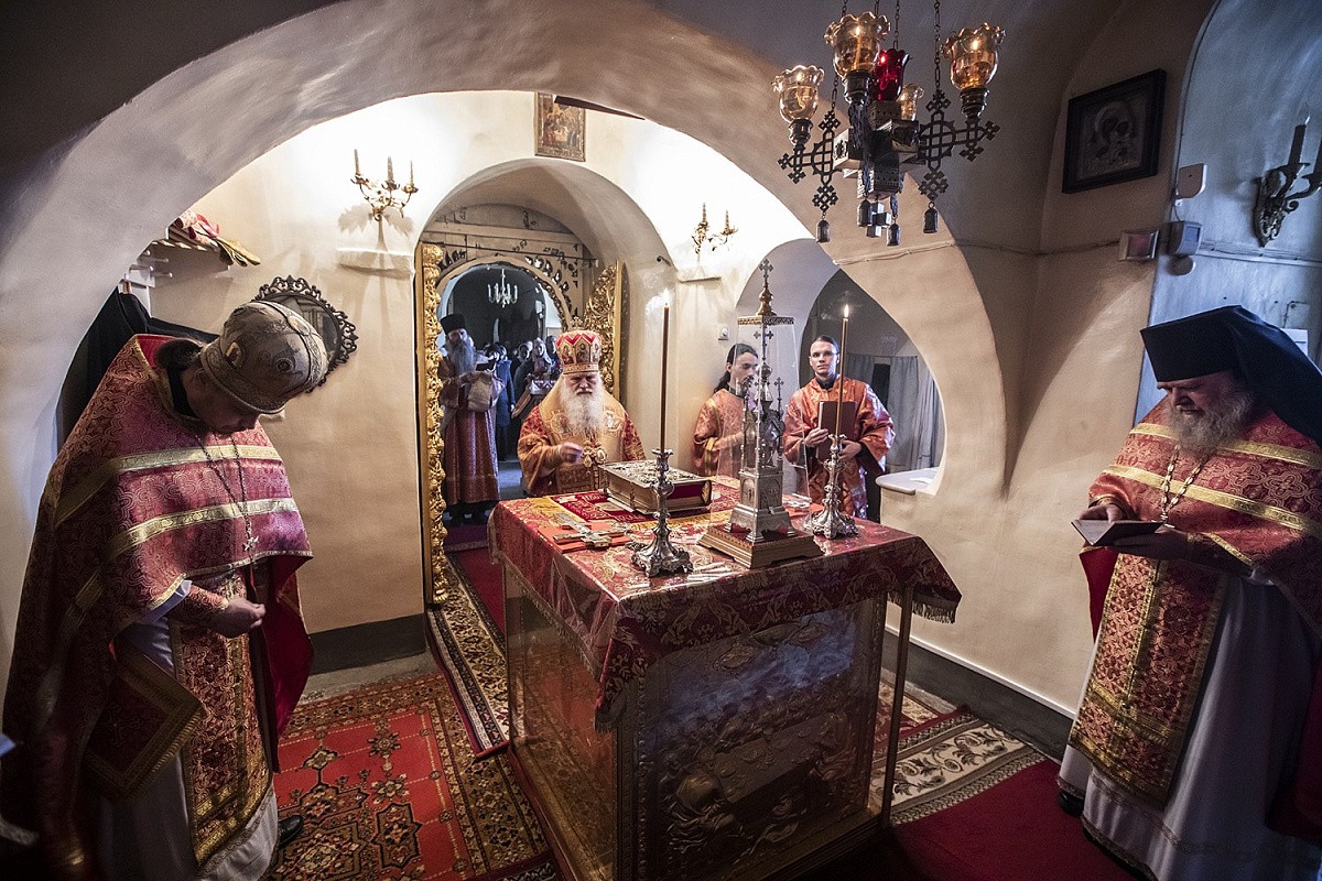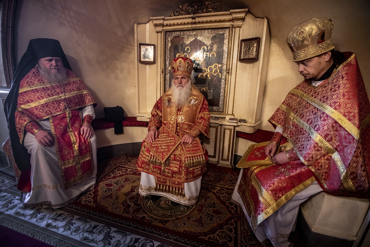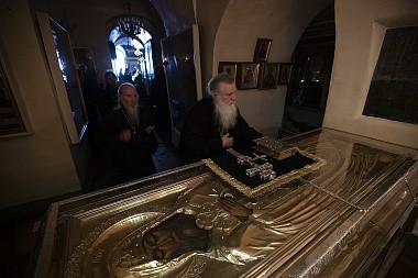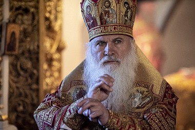 Его Высокопреосвященство принял участие в братском молебне, а также возглавил Божественную литургию в Успенском храме Псково-Печерской обители.
