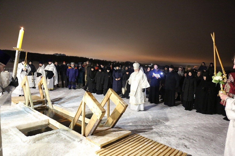 По окончании Литургии священнослужители, сестры обители и паломники во главе с архипастырем прошли крестным ходом от храма к реке Волге, где владыка совершил чин великого освящения воды.