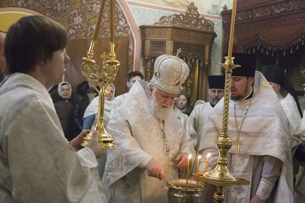 За Божественной литургией Его Высокопреосвященству сослужили секретарь епархии иерей Александр Пчелкин, ректор семинарии иерей Олег Овчаров и клирики епархии.