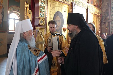 В свою очередь, игумен Алексий (Горлычев) обратился к владыке с благодарственным словом и преподнес Его Высокопреосвященству образ Божией Матери «Прежде Рождества и по Рождестве Дева», почитаемый в Николо-Пешношском монастыре.
