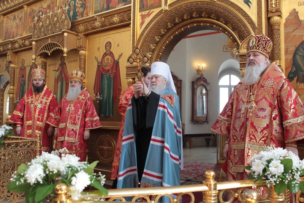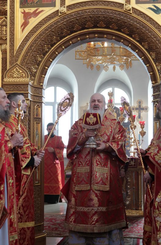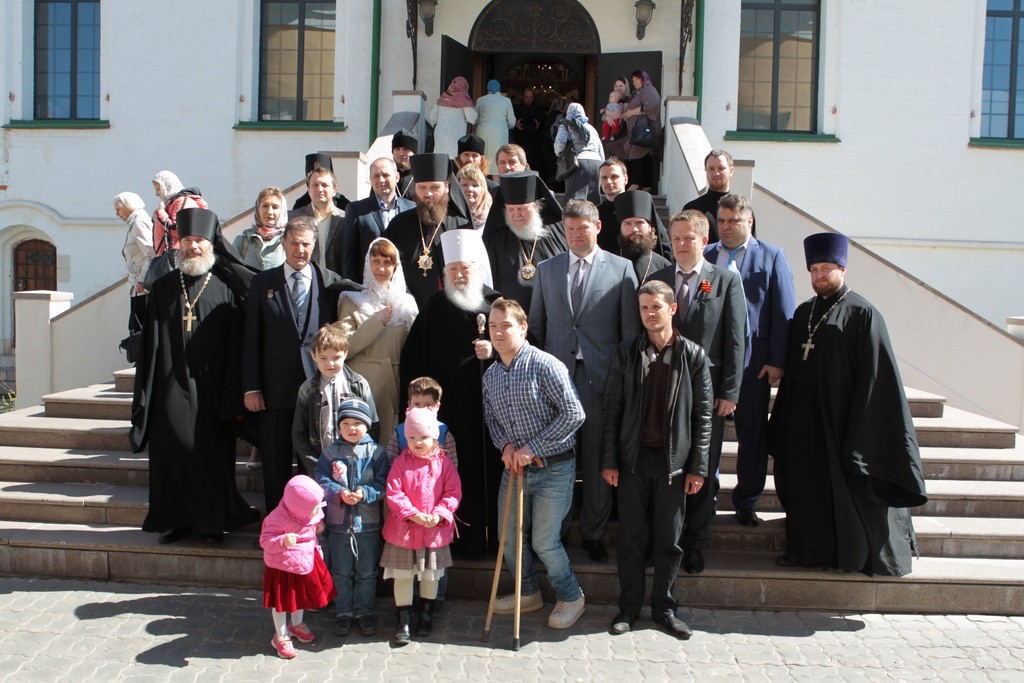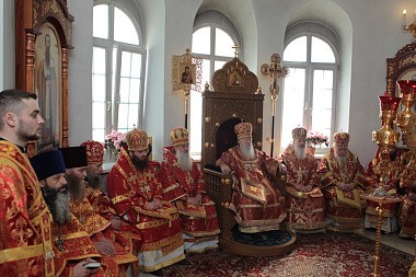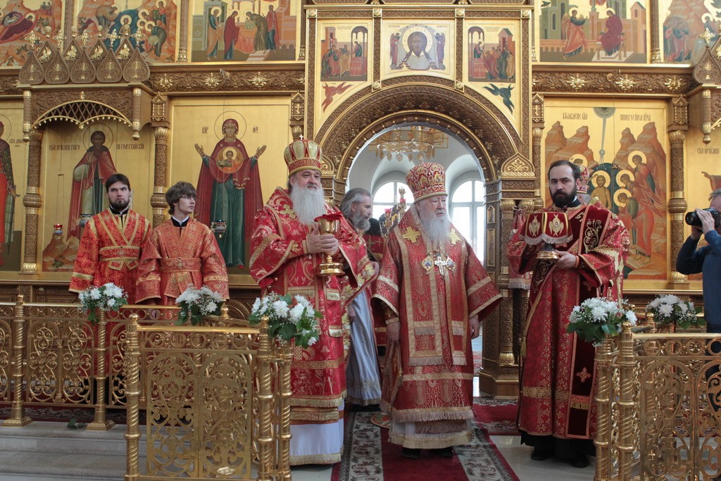 За Божественной литургией в Богоявленском соборе Старо-Голутвина мужского монастыря Его Высокопреосвященству сослужили епископ Видновский Тихон, благочинный монастырей Московской епархии епископ Серпуховской Роман, епископ Балашихинский Николай, ректор Коломенской духовной семинарии епископ Зарайский Константин, благочинный церквей города Коломны и Коломенского округа епископ Луховицкий Петр, игумен Богоявленского Старо-Голутвина монастыря игумен Варлаам (Горбунов), благочинные церковных округов Московской епархии: Егорьевского – игумен Никодим (Лунев), Зарайского – протоиерей Петр Спиридонов, Ступинского – протоиерей Евгений Ряполов, Воскресенского – протоиерей Сергий Якимов, Луховицкого – протоиерей Кирилл Сладков, Малинского – протоиерей Сергий Кулемзин, регент хора духовенства Московской епархии священник Сергий Голев, духовенство Коломны и Коломенского района.