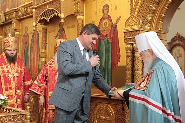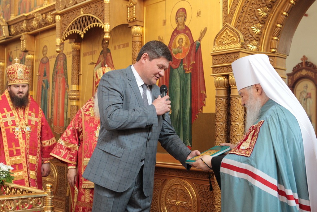 Затем к митрополиту Ювеналию обратился глава городского округа Д. Ю. Лебедев, который подарил Владыке книгу «Собор Коломенских новомучеников», подготовленную к изданию городской администрацией при содействии действующего при Бобреневом монастыре Общества любителей церковной истории имени священноисповедника Феодосия, епископа Коломенского.