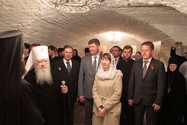 После памятного снимка в подклете Богоявленского собора состоялось открытие выставки, посвященной новомученикам и исповедникам Коломенским.