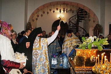 Чин великого освящения воды и ночную праздничную Литургию в Благовещенском храме совершили клирики монастыря иеромонах Вениамин (Комоликов) и иерей Николай Сорокин.