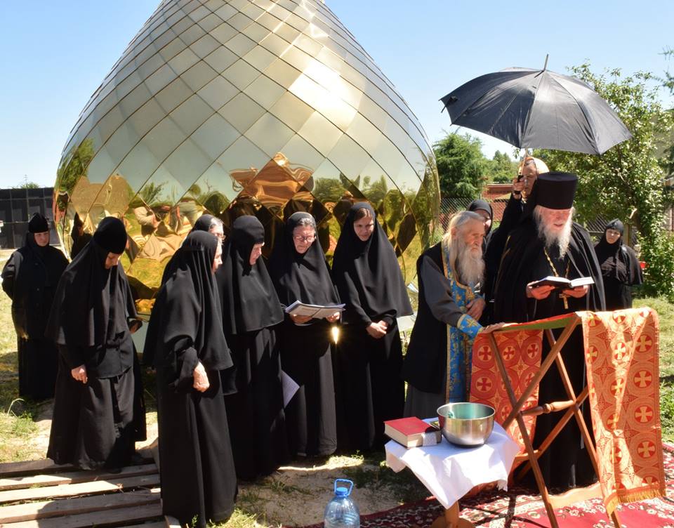 По благословению преосвященнейшего Никиты, епископа Козельского и Людиновского, духовник обители схиархимандрит Илий (Ноздрин) совершил чин освящения креста и куполов строящегося на месте сгоревшего 25 января 2017 года домового храма обители.