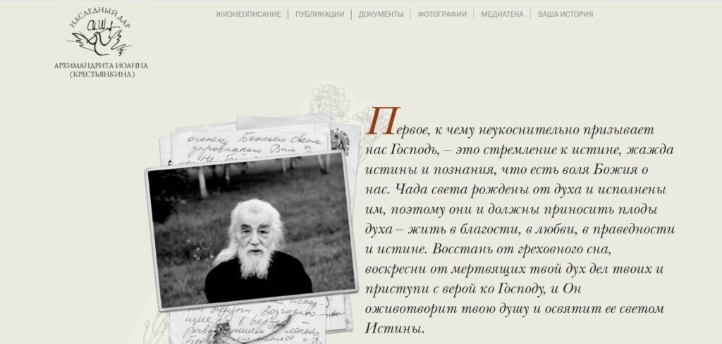 Начал работу сайт, посвященный памяти старца Иоанна (Крестьянкина). На данном портале размещена история жизни знаменитого насельника Успенского Псково-Печерского мужского монастыря, фотографии, видео- и аудиозаписи. Также на новом сайте посетители найдут большое количество текстов в электронном формате: книги, написанные самим старцем, его письма и проповеди, а также научные труды о нем.