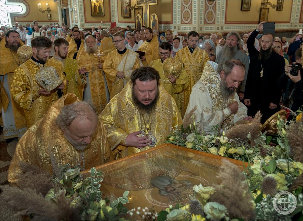 По окончании богослужения состоялся крестный ход вокруг Владимирского собора с изнесением ковчега с частицей мощей святого равноапостольного князя Владимира и праздничной аналойной иконы.