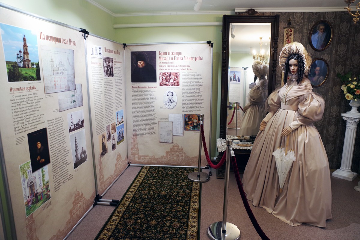 Экспозиция музея рассказывает о жизни и духовном подвиге Елены и Михаила Мантуровых, об истории с. Нучи и местного храма в честь Всемилостивейшего Спаса. В музее можно увидеть и святыни: гвозди от гроба Елены Мантуровой (преподобной Елены Дивеевской), части ее четок и кожаной обуви, найденные при обретении мощей.