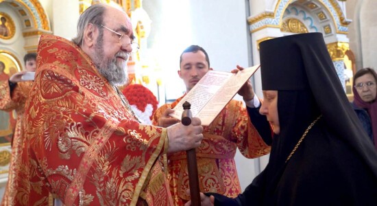 Также митрополит Владимир вручил новопоставленной игумении Таисии напрестольное Евангелие и обратился с напутственным словом.