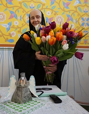 По окончании воскресной Литургии 2-й Недели Великого поста в расписанной в византийском стиле трапезной насельницы обители исполнили матушке Неонилле «Многая лета», поздравили ее с праздником и подарили большой букет весенних цветов.