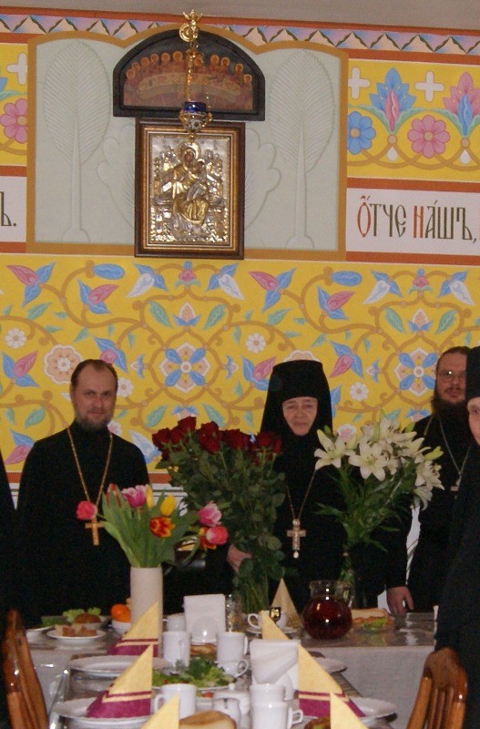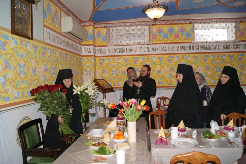 Поздравления продолжились в сестринской трапезной: матушку Неониллу поздравили прибывшие с монастырского подворья иеромонахи Вениамин (Комоликов) и Тихон (Орлов), насельницы монастыря, организаторы Паломнической службы монастыря, трудники и гости. Матушке преподнесли белые лилии, красные розы и разноцветные тюльпаны. Угощения на праздничном столе соответствовали начавшейся в этот день сплошной седмице перед Великим постом – Масленице.