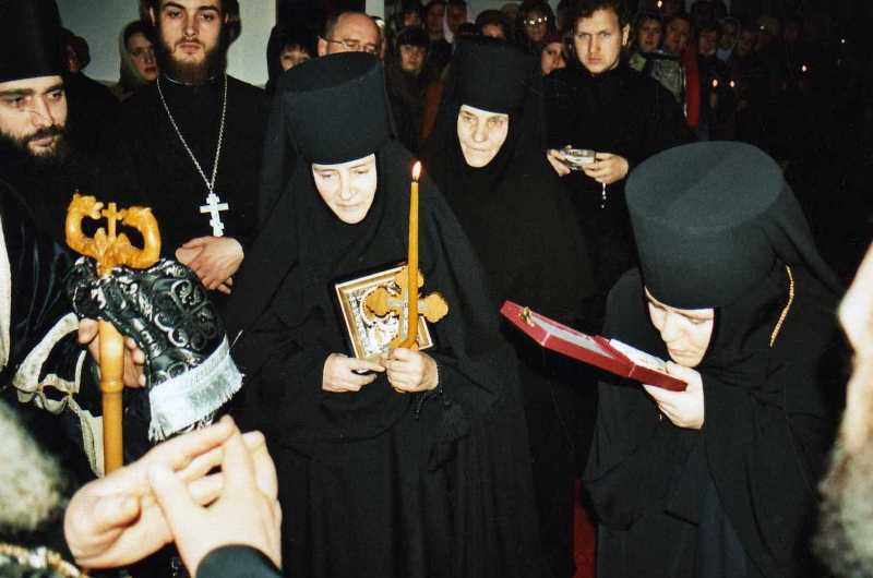 Постриг был назначен вечером в верхнем приделе храма "Всецарица". В день пострига пошел сильный дождь, был полный храм прихожан, приехал владыка Исидор. Мне в длинной белой сорочке с непокрытой головой пришлось ползти по гранитному полу к владыке, а приглашенные монахини покрывали меня своими мантиями. По бумажке я читала положенные в чине пострига ответы на вопросы, задаваемые владыкой, не до конца их осознавая.