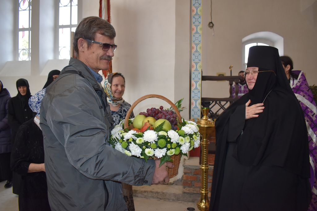 Прихожане святой обители также поздравили матушку Марию, подарили большую цветочную корзину с фруктами, пожелав доброго здравия, всесильной помощи Божией в трудах и заботах на благо Церкви Христовой. М. М. Дружинина, прихожанка обители, зачитала свое стихотворение с добрыми пожеланиями в адрес игумении Марии.