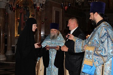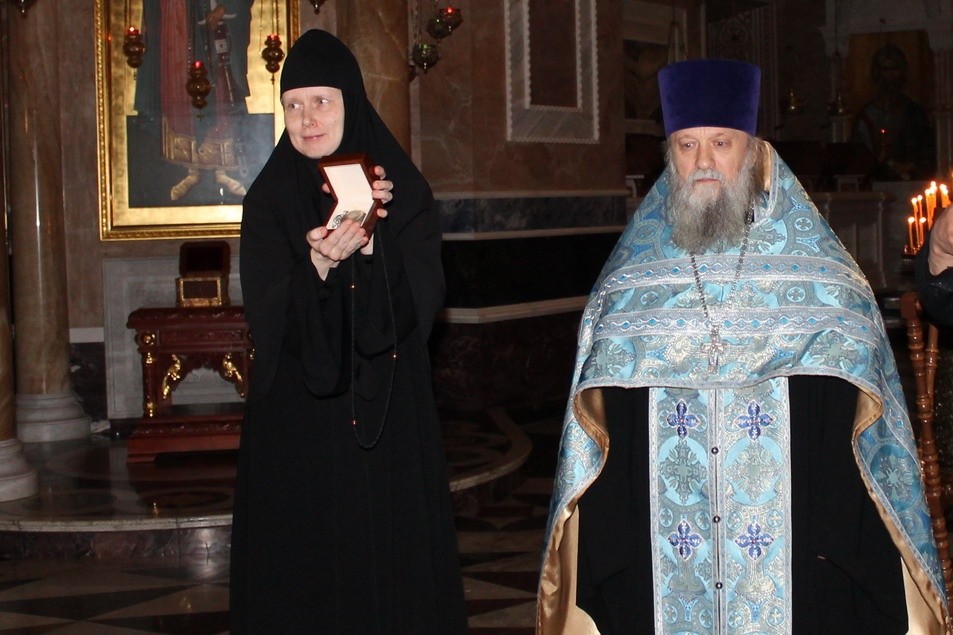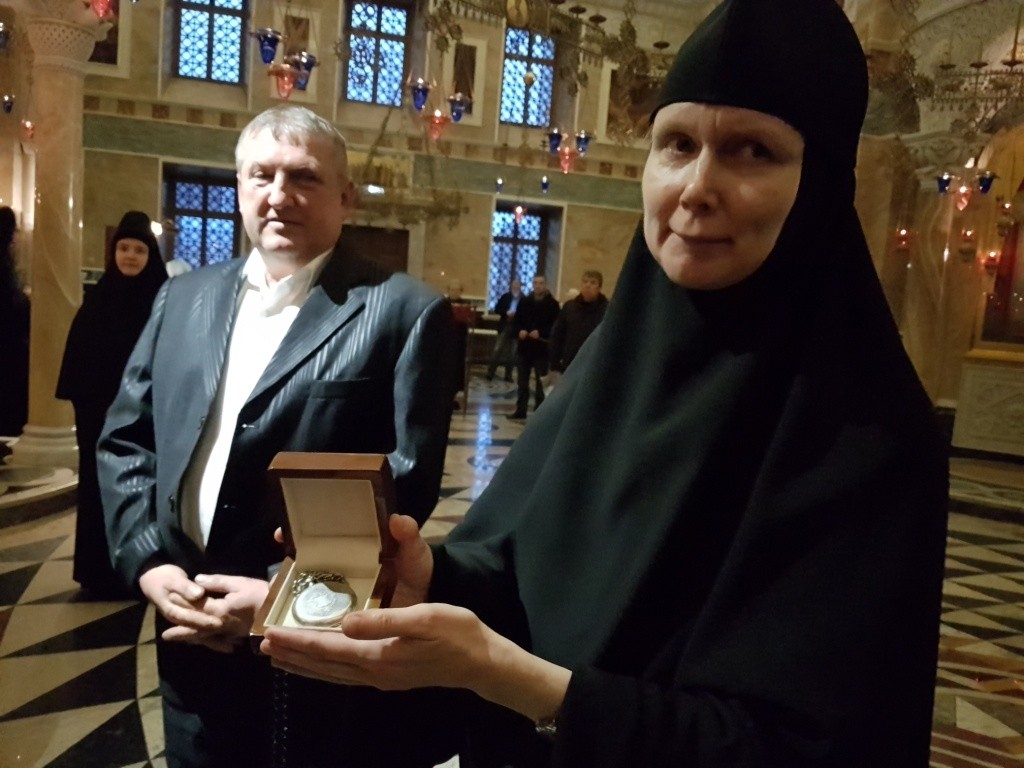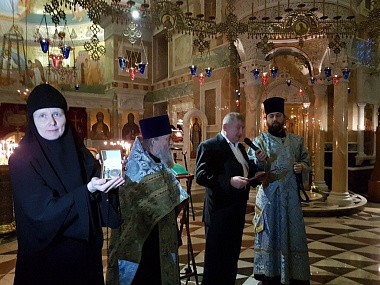 Перед передачей часов в Александро-Невском соборе обители был совершен молебен святому страстотерпцу доктору Евгению Боткину, затем в ходе передачи часов в адрес дарителя была озвучена благодарность от имени настоятельницы Александро-Невского Ново-Тихвинского женского монастыря игумении Домники (Коробейниковой) и сестер обители.