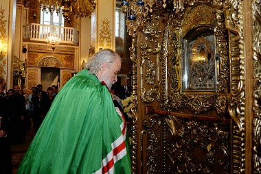 В соборе в честь Грузинской иконы Божией Матери Святейший Владыка прочитал молитву и поклонился чудотворному Грузинскому образу Богородицы.