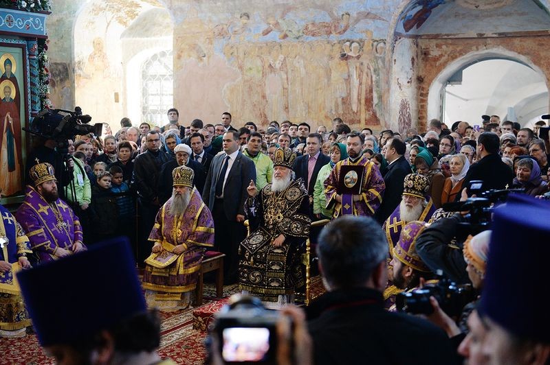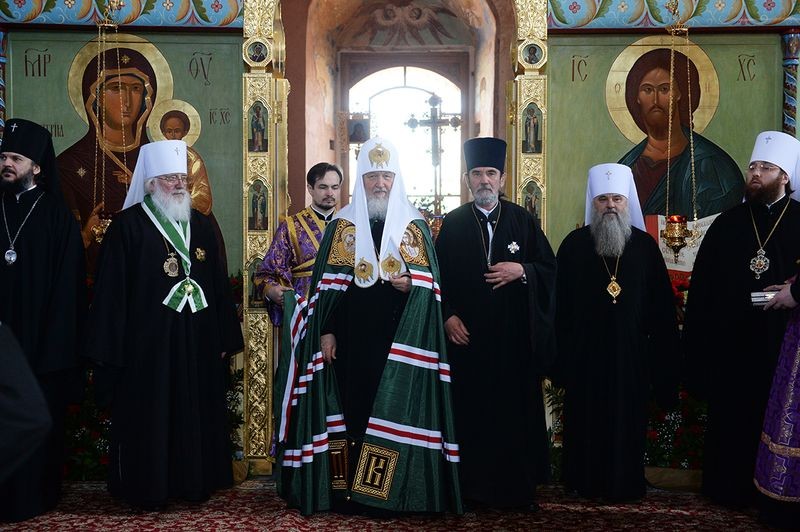 Затем Святейший Владыка поклонился честным мощам прп. Александра Свирского, покоящимся в Спасо-Преображенском соборе, после чего направился на территорию Троицкого комплекса монастыря, где возглавил служение Божественной литургии свт. Василия Великого в соборе Живоначальной Троицы.