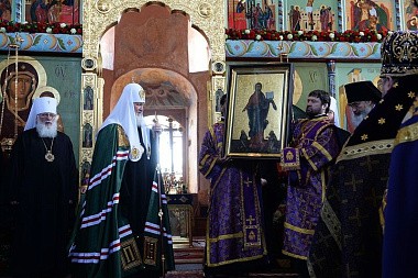 Святейший Патриарх Кирилл поблагодарил епископа Мстислава, игумена Антония с братией и всех, кто потрудился для восстановления обители. В дар монастырю Святейший Владыка передал старинную икону преподобного Александра Свирского, написанную по заказу святителя Макария, митрополита Московского, в XVI веке. Образ был выкуплен у зарубежных коллекционеров благотворителем обители В.Н. Жимировым.