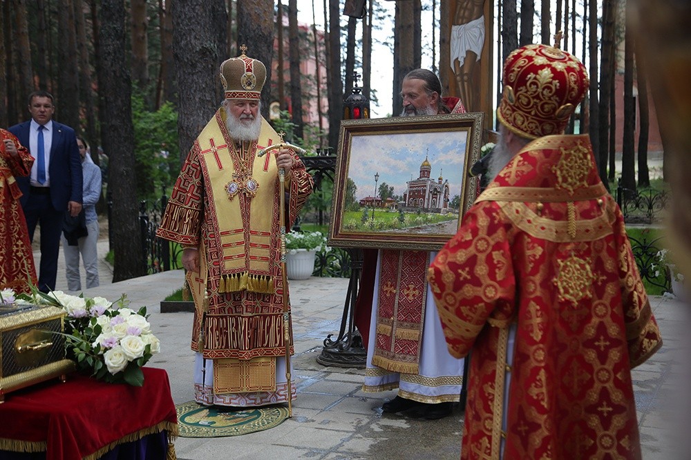 Епископ Каменский Мефодий приветствовал Святейшего Патриарха и преподнес Его Святейшеству список Феодоровской иконы Божией Матери, икону преподобномученицы Елисаветы Феодоровны и картину художника А.В. Ефремова «В Свято-Елисаветинском монастыре. Алапаевск».