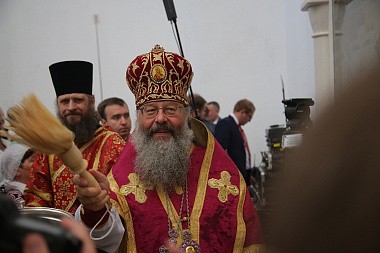 Затем Святейший Владыка приветствовал архипастырей, наместника монастыря игумена Моисея с братией, духовенство Екатеринбургской митрополии.