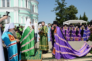 От лица насельниц и паломников игумения Сергия (Конкова) приветствовала Святейшего Владыку и преподнесла Его Святейшеству написанную сестрами обители икону Собора Дивеевских святых с частицами мощей.