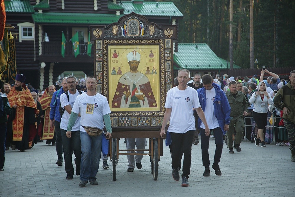 По традиции шествие совершалось с хоругвями и иконами, в том числе с двухметровой иконой императора Николая II, созданной в 2017 году для храма в честь иконы Божией Матери «Державная» на Ганиной Яме. Вес иконы с киотом – около 150 кг. Так как икона очень тяжелая, для ее перемещения были изготовлены специальные носилки на колесах.