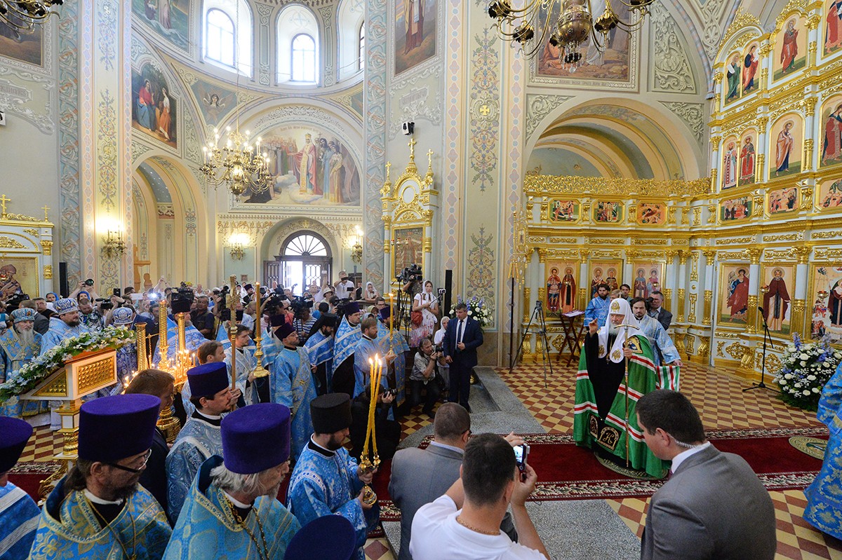 Его Святейшеству сослужили: митрополит Санкт-Петербургский и Ладожский Варсонофий, управляющий делами Московской Патриархии; митрополит Чебоксарский Чувашский Варнава; митрополит Уфимский и Стерлитамакский Никон; митрополит Казанский и Татарстанский Феофан; митрополит Нижегородский и Арзамасский Георгий; архиепископ Берлинско-Германский и Великобританский Марк; архиепископ Йошкар-Олинский и Марийский Иоанн; епископ Солнечногорский Сергий, руководитель Административного секретариата Московской Патриархии; епископ Альметьевский и Бугульминский Мефодий; епископ Чистопольский и Нижнекамский Пармен; протоиерей Владимир Самойленко, секретарь Казанской епархии, настоятель храма Рождества Христова г. Казани; игумен Силуан (Хохиашвили), настоятель Успенского монастыря в Свияжске; протоиерей Владимир Вигилянский, настоятель храма Св. мц. Татианы при МГУ г. Москвы; священник Димитрий Сафонов, секретарь ОВЦС по межрелигиозным отношениям, исполнительный секретарь Межрелигиозного совета России; духовенство Татарстанской митрополии.