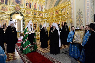 По завершении всенощного бдения митрополит Феофан приветствовал Святейшего Владыку и преподнес Его Святейшеству икону святителей Казанских Германа, Гурия и Варсонофия, написанную насельниками Успенской обители в Свияжске.