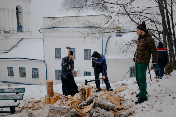 По окончании экскурсии ребята начали колоть дрова, а девушки занялись уборкой в храмах.