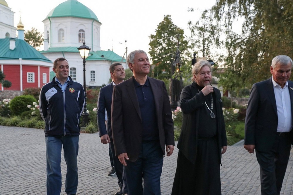 3 сентября 2023 года Председатель Государственный Думы Вячеслав Володин в ходе рабочей поездки в Псковскую область посетил Свято-Успенский Псково-Печерский мужской монастырь, которому недавно исполнилось 550 лет, и встретился с игуменом обители митрополитом Псковским и Порховским Тихоном (Шевкуновым).