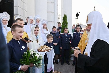 У врат Успенского собора Свенской обители Святейшего Владыку встречали митрополит Брянский и Севский Александр, губернатор Брянской области А.В. Богомаз, архиереи и духовенство Русской Православной Церкви.