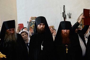 У Святых врат обители Святейшего Патриарха Кирилла встречал наместник монастыря игумен Игнатий (Молчанов) с братией обители.
