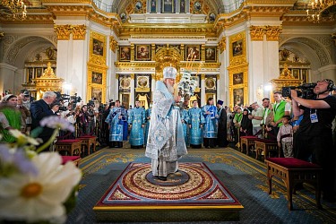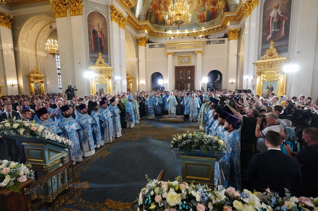 По окончании Литургии Святейший Патриарх Кирилл и архиереи, участвовавшие в богослужении, возложили цветы на могилу митрополита Феофана (Ашуркова; 21 мая 1947 г. – 20 ноября 2020 г.), которая находится за алтарем Казанского собора, и пропели «Вечную память» приснопамятному архипастырю.