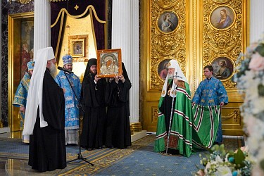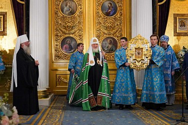 Митрополит Казанский и Татарстанский Кирилл от лица архиереев, духовенства и верующих Татарстанской митрополии приветствовал Святейшего Владыку и преподнес в дар Его Святейшеству старинный Казанский образ Божией Матери, украшенный сестрами Казанского Богородицкого женского монастыря.