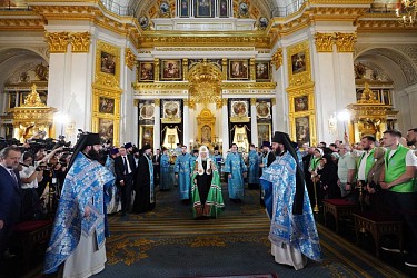 По прибытии в собор Предстоятель Русской Православной Церкви поклонился мощам святителя Варсонофия, епископа Тверского, чудотворца Казанского, и чтимому списку Казанской иконы Божией Матери.