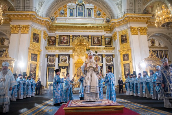 Затем Предстоятель Русской Церкви совершил чин великого освящения двух престолов воссозданного собора – главного в честь Казанской иконы Божией Матери и левого в честь благоверного князя Александра Невского. В завершение чина великого освящения, Святейший Владыка возглавил крестный ход с частицами мощей вокруг собора.