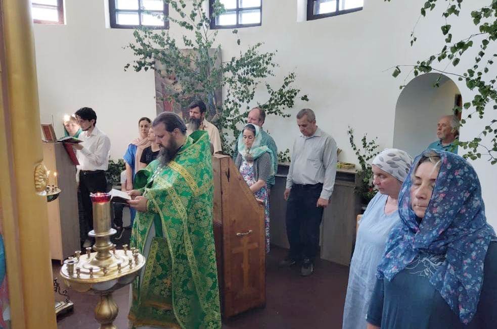 Богослужение совершает настоятель Архиерейского подворья Свято-Введенской церкви бывшего Свято-Троицкого Макарьева мужского монастыря иеромонах Амвросий (Желябовский).