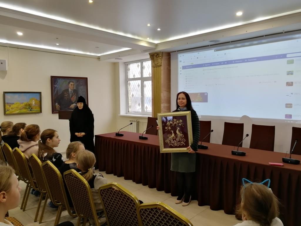 Вместе с экскурсоводом гости монастыря осмотрели храмы, побывали в интерактивном музее «Малоярославец», побывали на Ильинских рубежах – на местах боев и в музейно-образовательном комплексе с храмом-памятником и молодежным военно-спортивным лагерем «Ильинские рубежи 1941» в Андреевском скиту монастыря на территории сельского населения Ильинское. Третий день киношколы – это традиционное награждение работ участников, включенных в программу кинопросмотра кинофестиваля «София» дипломами. Помимо дипломов киношколы на этот раз был вручен диплом о присуждении специального приза исторического мультимедиа фестиваля-марафона «Предел нападения»: от 80-летия боев на Ильинских рубежах к 210-летию Малоярославецкого сражения Е.Н. Бредневой – директору кинофестиваля «София», руководителю фестивального движения «Мы сами снимаем кино», члену правления Ассоциации кинопедагогов России «Образ», и теперь еще заместителю директора Фонда «Медиапросвещения» и одному из основателей проекта «Святые онлайн». Специальный приз – вышитая сестрами картина «Отрада», изображающая райских птиц – символ Рая с пожеланием, чтобы все ее творчество приносило людям именно ощущение Рая.