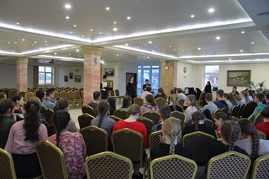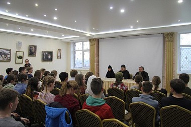 Студентам был предложен чай с угощением, показан фильм об истории возрождения монастыря, после которого ребята и девушки могли задать свои вопросы, связанные с посещением обители, духовной жизнью, Великим постом и т.д. Игумения Николая поблагодарила гостей за помощь на послушаниях и пригласила приехать на праздничное пасхальное богослужение и остаться на праздничные трапезу и концерт.