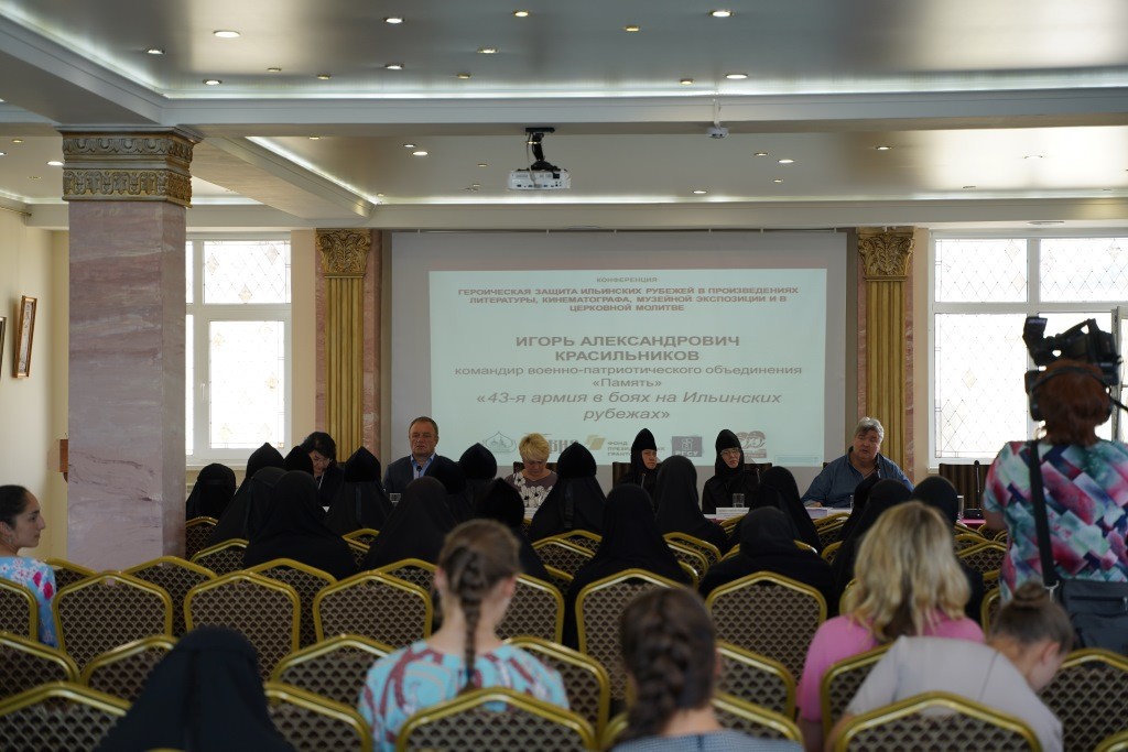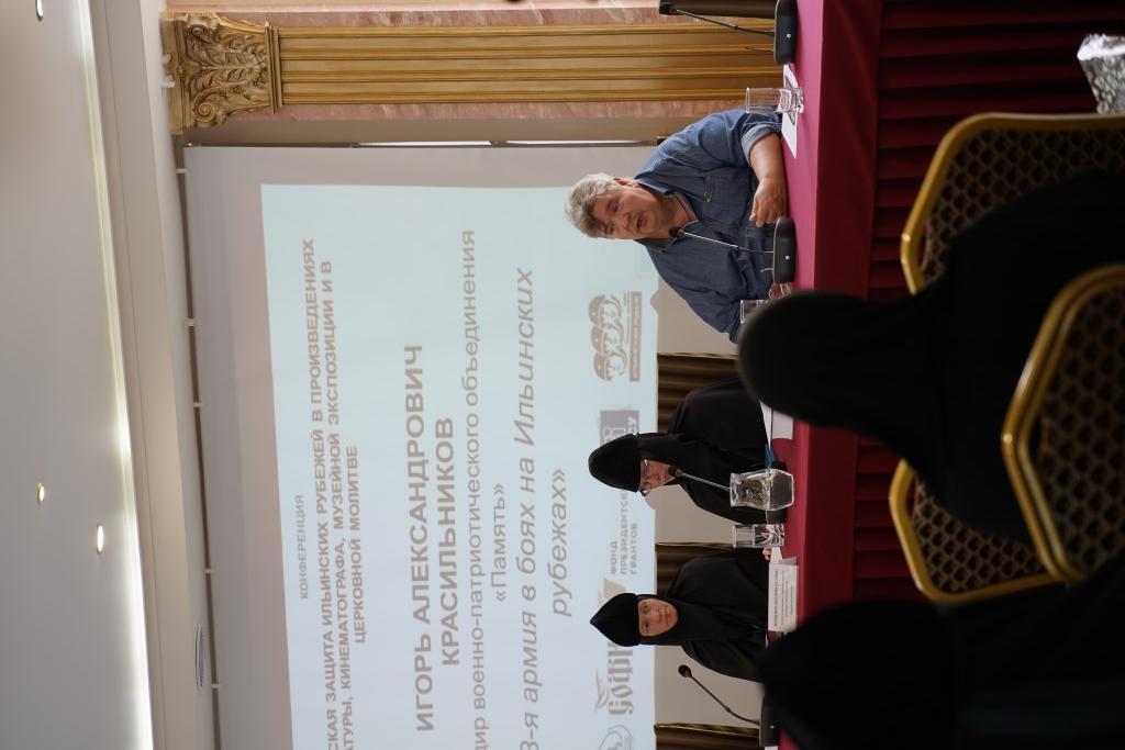 Далее ведущая конференции, внучка легендарного лейтенанта А. И. Алешкина, И. В. Бабакова передала слово первому из докладчиков. Первый доклад конференции вводил в исторический контекст боев на Ильинских рубежах. И. А. Красильников, командир военно-патриотического объединения «Память», рассказал о боях на Ильинских рубежах с участием 43-й армии, представил результаты своих многолетних изысканий в военных архивах, которые были опубликованы в виде объемных сборников официальных документов, воспоминаний, дневников и других исторических свидетельств. Командир ВПО «Память» обрисовал хронику боев, описал проблемы тылового обеспечения боеприпасами и продовольствием частей, которые сражались на Ильинских рубежах, личный состав различных частей, проблемы координации между действиями частей, входивших в состав разных фронтов. В завершение доклада Игорь Александрович преподнес в дар монастырю фолиант более чем в 1000 страниц – «93 дня битвы за Москву: документальная хроника с 30 сентября по 31 декабря 1941 года Западного фронта Красной Армии и группы армии "Центр» Германии"» из серии книг «Документальная хроника Второй мировой войны», а также пообещал подарить и свою предыдущую книгу «Первые 103 дня войны Западного фронта и группы армий "Центр". 1941 год», когда выйдет второе, дополненное, издание уже давно разошедшегося тиража.