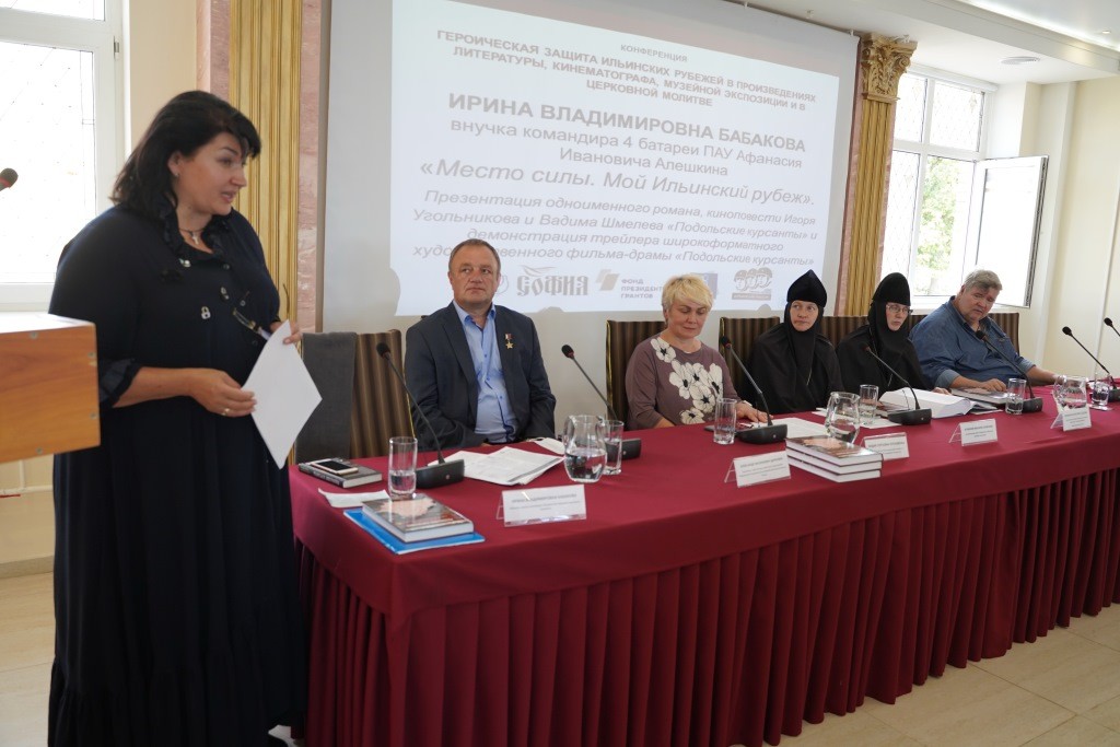 Последний доклад конференции представила И. В. Бабакова. Внучка легендарного командира подольских курсантов рассказала об истории появления «Народного кинопроекта», о том, как честь выполнять «народный заказ» по увековечиванию памяти о подольских курсантах в киноэпопее была присуждена компании «Военфильм», об истории создания сценария и написания на его основе киноповести, которая уже издана и поступила в продажу. Ирина Владимировна рассказала также о рукописи второй своей книги – романа «Место силы: мой Ильинский рубеж», в которую вошли многие из воспоминаний, услышанных ею от своей бабушки, вдовы лейтенанта Алешкина, и ветеранов-выпускников подольских военных училищ, силами которых был возведен в с. Ильинском белокаменный монумент и создан действующий ныне музей. Планируется публикация этого романа к 79-летию подвига подольских курсантов – к 5 октября этого года.