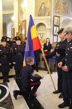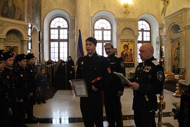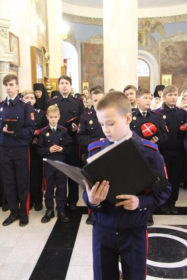 Пять девочек, четыре из которых – воспитанницы детского православного пансиона «Отрада», и четыре мальчика приносили торжественное обещание служить Отечеству, казачеству и вере православной и по первому зову выступить на защиту перед крестом и Евангелием в присутствии настоятельницы Свято-Никольского Черноостровского женского монастыря игумении Николаи (Ильиной), насельниц обители, отца Владимира Матвейчука, воспитанниц детского православного пансиона «Отрада», прихожан и гостей, атамана и подхорунжего Малоярославецкого хуторского казачьего общества «Хутор Малоярославецкий».