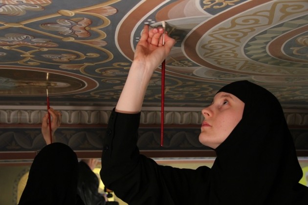 Иконописная мастерская также представит на выставке копии с древних фресок, выполненные сестрами во время учебных поездок в Сербию и Македонию. Сестры посещали храмы святого великомученика Георгия в Старо Нагоричино (Македония) и святых Богоотец Иоакима и Анны в монастыре Студеница (Сербия), где сохранились фрески XIV века, выполненные в лучших традициях византийской иконописи. В этих храмах сестры в течение нескольких дней с раннего утра до позднего вечера изучали фрески и делали копии. На выставке можно будет увидеть эти работы: образы Пресвятой Богородицы, святого евангелиста Марка, святителя Василия Великого и другие. Сестры постарались в точности повторить цветовую гамму и иконографию древних фресок. На выставке также будут представлены рисунки и цветовые эскизы росписей двух монастырских храмов: собора Александра Невского и храма Божией Матери «Всех скорбящих Радость». Эти работы наглядно показывают сложный процесс создания росписей.