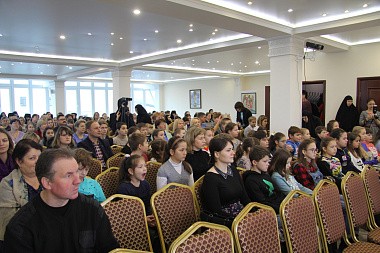 Вслед за старшим товарищем выступил самый молодой из гостей-космонавтов Сергей Николаевич Рыжиков, только в апреле этого года вернувшийся из своего первого полета на орбитальную станцию. Он также показал фильм-презентацию о подготовке космонавтах и тех экзаменах, которые им доводится сдавать во время подготовки к полету, поделился воспоминанием о том, как получал напутствие при выборе профессии. Юрий Иванович Маленченко, уже знакомый учащимся Православной гимназии по предыдущим визитам в Свято-Никольский Черноостровский монастырь, был наиболее краток в своем приветственном слове, и также показал небольшой, 8-минутный фильм про историю Центра подготовки космонавтов с момента его возникновения в послевоенные годы в Советском Союзе. Затем дети смогли задать вопросы героям России, поинтересоваться причинами, вызвавшими в них интерес к космосу, трудностями, с которыми космонавты сталкиваются в своей профессии, а также тем, какими качествами должны обладать покорители космоса.