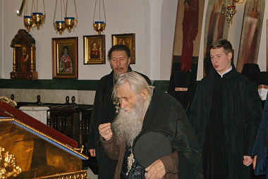 Благословив монашествующих и мирян, отец Илий посетил главный храм монастыря в честь иконы Божией Матери «Всецарица». В храме батюшка помолился у чудотворной иконы «Всецарица», у мощей и икон святых угодников Божиих. Затем благословил монахинь, спросив у каждой имя.