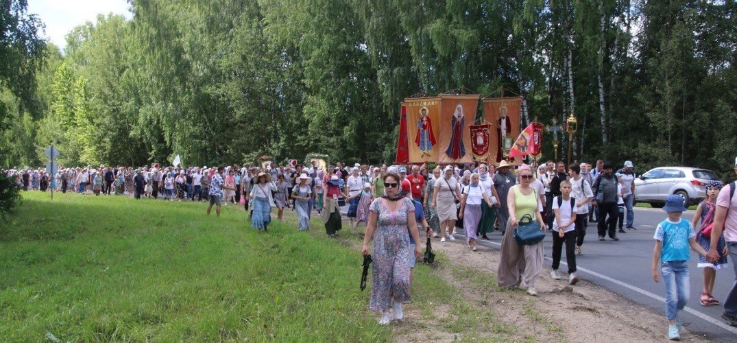 Крестоходцы несли храмовые иконы преподобного Серафима Саровского, Божией Матери «Скоропослушница» и хоругви. С пением акафиста батюшке Серафиму они прошли от храма в честь Всех святых через Успенский монастырь – Саровскую пустынь на Ближнюю и Дальнюю пустынки преподобного Серафима, где были совершены молебны. Затем верующие направились в сторону Дивеева, сделав в черте города остановку и помолившись у храма в честь Царственных страстотерпцев.