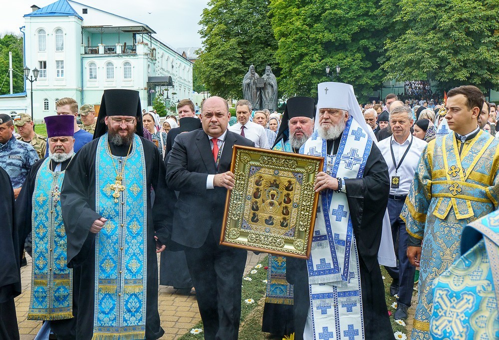 В Коренной пустыни святыню встретил врио губернатора Курской области Алексей Смирнов, насельники монастыря во главе с наместником игуменом Серафимом (Котельниковым). Вместе они сопроводили икону в соборный храм Рождества Пресвятой Богородицы, где был совершен праздничный молебен.