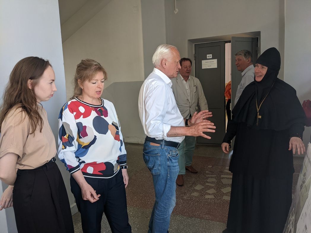 Разрабатывая проект, студентка и её научный руководитель обращались за консультациями к настоятельнице Челябинского Одигитриевского женского монастыря игумении Евсевии (Лобановой). Теперь матушка игумения побывала на защите выпускной работы и поздравила нового специалиста по дизайну архитектурной среды.