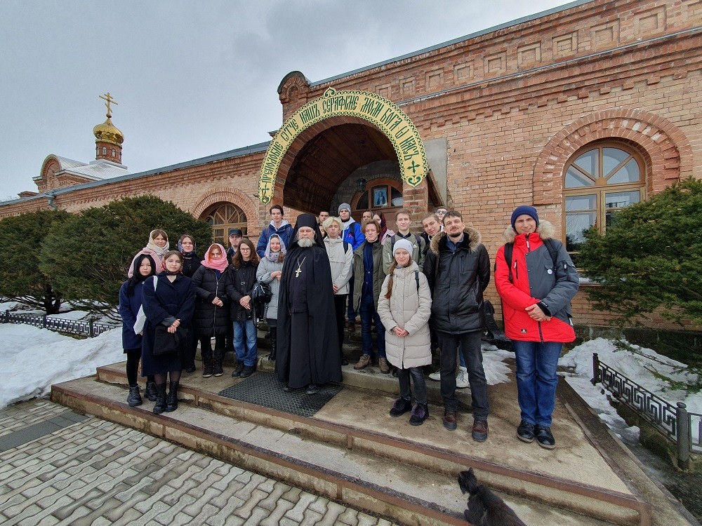С монастырем и его жизнью молодежь познакомил иеромонах Серафим, который рассказал об истории обители, ее святынях, о храмах Серафима Саровского и Крестовоздвиженском. Студенты смогли также посетить новую колокольню, познакомиться с работой скотного двора. В трапезной монастыря гостям был предложен чай с постными пряниками, выпекаемыми в обители. За угощением состоялась духовная беседа о святых подвижниках Православия.