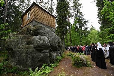 Затем Святейший Владыка посетил часовню преподобного Арсения Коневского, установленную на Конь-камне – месте древнего финно-угорского святилища. В часовне был пропет тропарь преподобному.