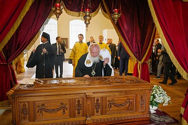 Святейший Патриарх Кирилл прошел в нижний храм Сретения Господня собора Рождества Пресвятой Богородицы, где поклонился главным святыням обители: честным мощам преподобного Арсения Коневского и Коневской иконе Божией Матери, которая является списком известного чудотворного образа.
